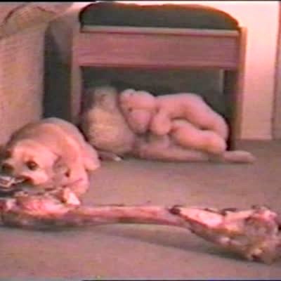 Little dog in ladybug costume growls at someone trying to steal bone, dog suddenly snaps and knocks camera out of person's hand.