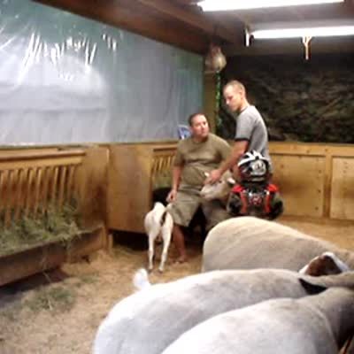 Boy wearing protective gear rides a sheep while laying down on it & holding tight. Sheep turns around & boy hits his head on the gate & falls off. People laugh, but shows no recovery. Boy has helmet on. Hard hit.