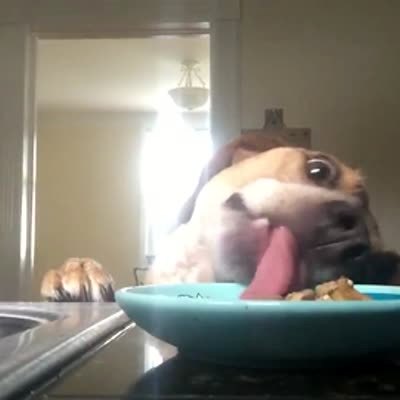 A dog jumps up to a counter and licks food off a plate. She pulls the plate closer and eats all the food off of it. steal