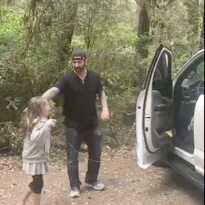 A man films a closeup of a tot girl in the hallway and asks her if she had used any of his hair products. The tot girl responds and the man pulls the camera back to reveal that the tot girl has a long strand of hair that sticks straight up in the center of her head.