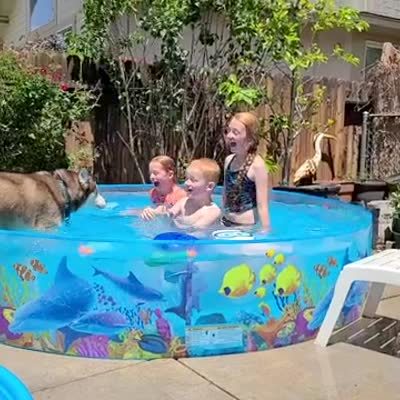Two young girls and a young boy call a husky dog into their kiddie pool in a yard. The dog jumps up and puts his front legs in. He then he pulls back the wall of the pool and water spills all over the ground.