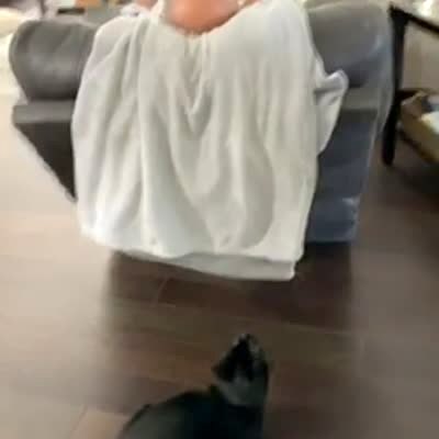 A cat jumps up at a toy that dangles in the living room above a man's bald head. When it jumps the cat gets its claw stuck on the man's head, then pulls him back in his recliner chair.