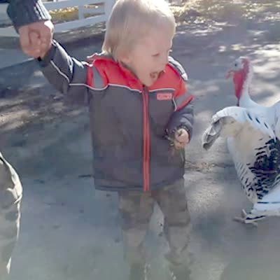 A tot boy looks up close at a turkey before the turkey flaps its wings and scares him. The boy screams as the turkey continues to follow him while his dad pulls him away. The mom admonishes the turkey and says "I will eat you!"