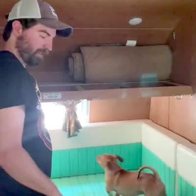 A man puts his Frenchie dog up on a pull out cot in a camper, and the dog falls through a latch on it.