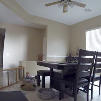A woman tries to pull a dog tethered to the front-porch into the house but the dog walks back and forth and runs into the yard. She gets caught up in the rope and trips and falls. Security footage.