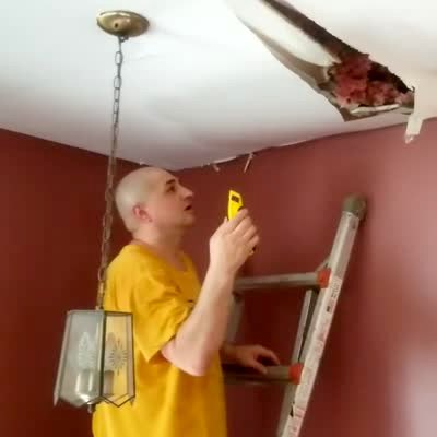 A man pulls open a crack in a ceiling, then he cuts out a large square and pulls it off. He holds it up over his head while insulation falls around him, then he drops it down and finds an empty bird's nest inside.