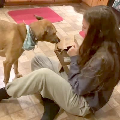 A teen girl sits on the kitchen floor and holds a cardboard box in her lap. She repeatedly sticks a hot dog up through holes in the box and a dog bites at the hot dog. The girl pulls the hot dog away and pops it up through different holes and the dog continues to bite at it.
