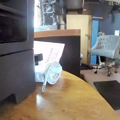 A man works at a standing desk in a home office. A cat sits on a chair behind him and jumps and climbs up his shoulders. The man gets hurt from the cat's claws and falls down. He accidentally pulls his keyboard down and it falls on his head. Security camera.