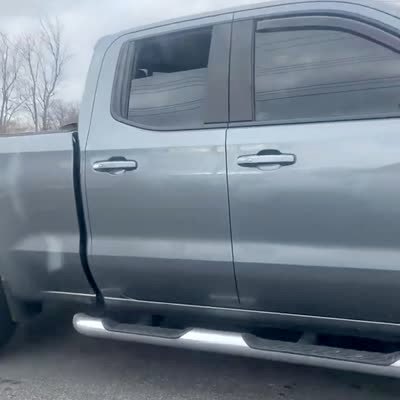 A man uses his pick-up truck to uproot a tree in his front yard and it falls on his truck when he pulls it out.