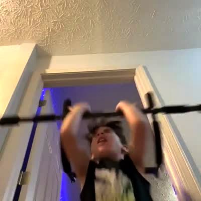 A young boy attempts to hop up and hang from his chin-up bar when the bar breaks and he face-plants into the camera.