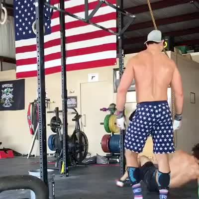 A man does pull ups in a gym, then he falls hard on his back.