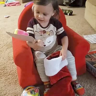A tot girl pulls a bottle of ranch dressing out of her Christmas stocking. She lifts it up and says, "I got ranch!" She the proceeds to walk around the room and show it off.