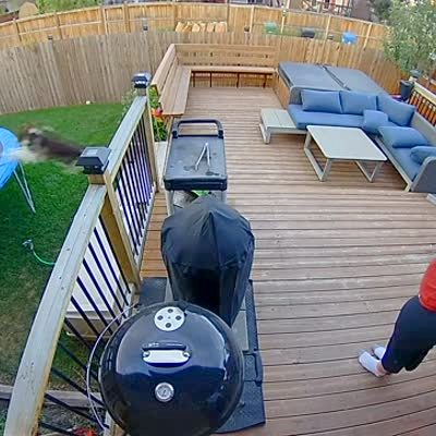 A young boy jumps on a trampoline in a backyard. A woman tells a dog to "go get your ball." The dog leaps up to the trampoline but only his top half lands. He uses a back foot to pull the rest of himself up onto it. Security Camera Footage.
