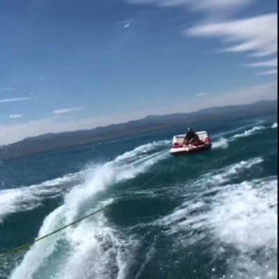A woman catches air as she gets tossed up off of an inner tube while pulled by a boat. Music rights not cleared.
