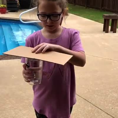 A young girl does an experiment where she uses air pressure to hold a piece of cardboard on an upside down cup so the water inside it won't come out. A dog walks up to the cardboard and pulls it away, then the water spills on the patio.