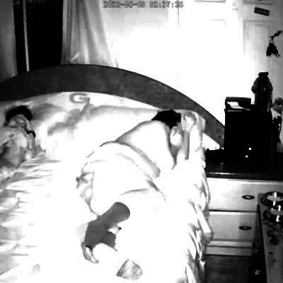 A raccoon sticks its head and one paw through an open window in a bedroom, then it pulls a bowl of cat food over to the window, and a man and woman wake up to stare at it. No audio. Security footage.