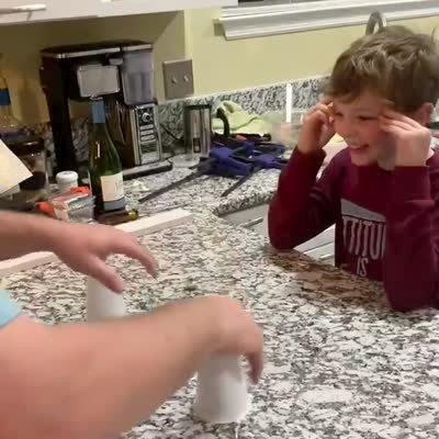 A man slides upside down cups around on the kitchen counter and a young boy picks which cup has the money under it. The cup that the boy picks has a dollar bill in it. The man pulls the other cups up and they have much more money in them and the boy is surprised that those cups had more money.