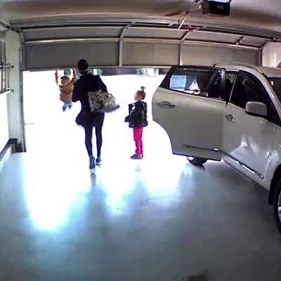 A woman and two young boys walk into the garage towards the car as the garage door goes up. One tot boy walks over to the door and grabs the bottom. The door pulls him off the ground and he rises up. The woman notices and grabs him before he falls. Security footage.