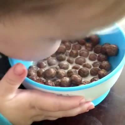 A tot boy presses his face into a bowl of cereal and eats from it in the living room. He pulls on it to pick it up, but it is suctioned to the table. He pulls harder and the bowl comes off the table and spills the milk and cereal on his face.