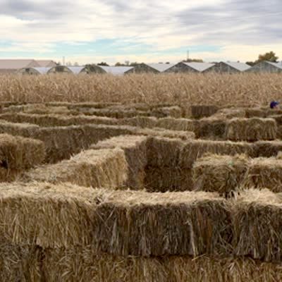 A group of kids all hop while they go through a hay bale maze at a pumpkin patch.