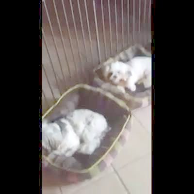 A woman watches a dog through a security camera and the dog chews and tears up a cushion from her living room couch and she screams and curses at him to stop. The dog ignores her and keeps chewing and another dog sits casually and watches.