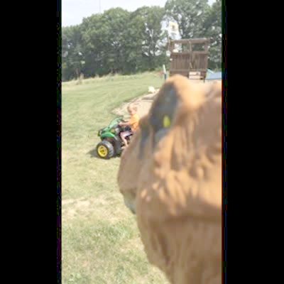 A man wears a dinosaur puppet on his hand and chases his son around a yard and films from the dinosaurs perspective outdoors.