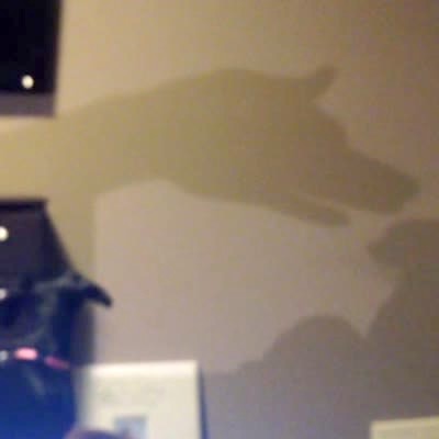 A little boy makes shadow puppets with his hands indoors and then gets distracted. An adult off camera makes a scary shadow puppet that snaps at him, startling the boy. The woman behind the camera laughs.