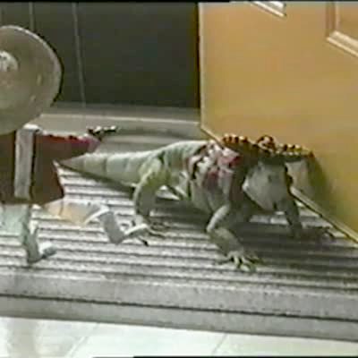 iguana dressed up in sombrero hits a puppet with its tail (11-109, 1515, 1602)