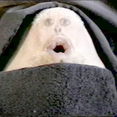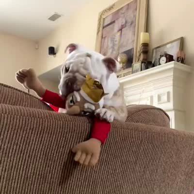 "Dog & Puppet Show" Stuffed duck teases pug dog. Dog stares blankly at duck face then slowly bites it at the end.