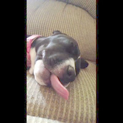 A pit bull lab mix dog sleeps indoors as her owner slowly pulls the dog's tongue all the way out and lets go to watch the tongue spring back in the dog's mouth.