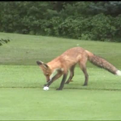 "Purr for the Course" Several men try to play golf on the putting green while a stray cat interferes.