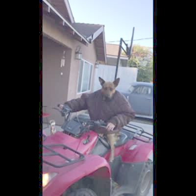 A teen boy in an inflatable Patrick Star costume from SpongeBob SquarePants rides an ATV in a yard and does a wheelie. He crashes into another ATV and falls off.