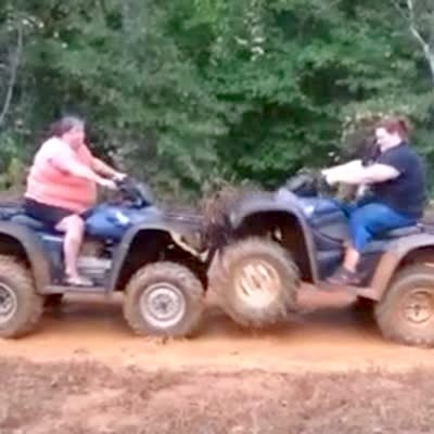 Young boy rides a four wheeler for the first time and crashes into a fence. Grandpa is sitting behind him on the ATV and they both flip over the handlebars.