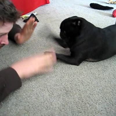 Black pug dog imitates man's quick hand movements, using his paw.