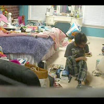 Teen girl accidentally cuts the TV power cord and gets blown back by a quick burst of flame