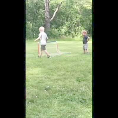 A tot boy and his older brother play soccer in the backyard, and their dad tells the tot boy not to let the ball into the net no matter what so he tips the net over and puts it face down in the grass.