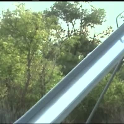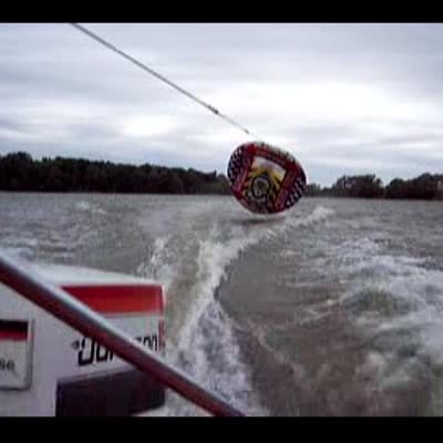 A man flies off a big tube raft into water. He's being pulled by a boat. Not the best shot of him flying off because it's too quick, but still looks kind of cool.