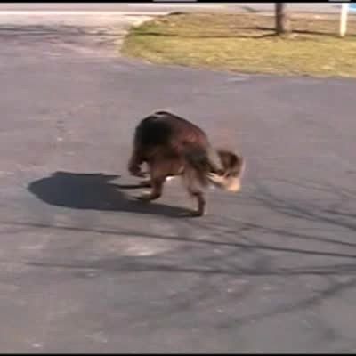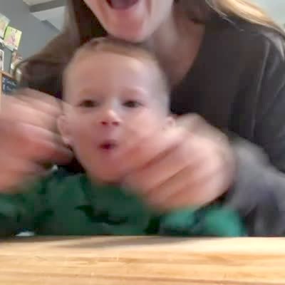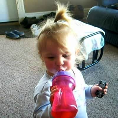 Baby girl drinks from a sippy cup. On the side of the frame, dog briefly scoots across floor dragging its butt. Very quick.