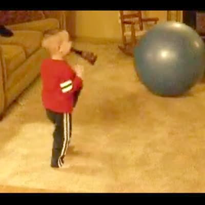 Little boy is hit with large exercise ball and knocked down in family room. Graphics over intro. DISSOLVES / edits in clip. Quick hit, goes to dissolve right away, short. (:09)