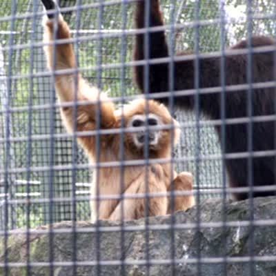 Two gibbon monkeys in a zoo hoot and howl at each other outdoors. One monkey jumps up and puts its butt in the others face to stop it.