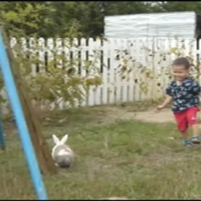 Tot boy chases a bunny around the backyard. The rabbit suddenly kicks the boy in the butt. Boy cries.