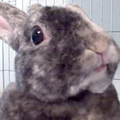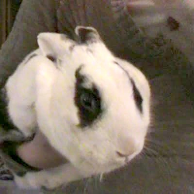 Rabbit is being pet near its eyes by teen girl who holds it in her arms. Bunny's ears pop up as she rubs under each eye.