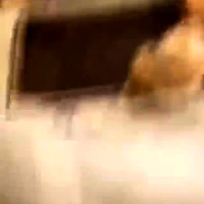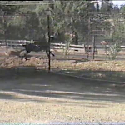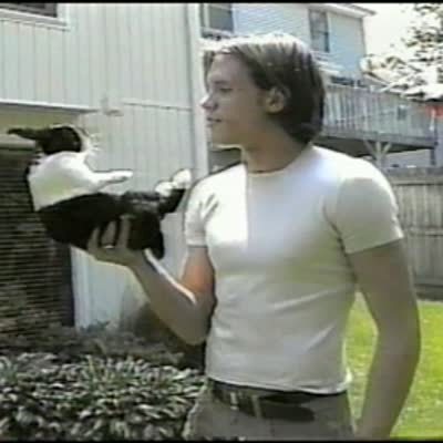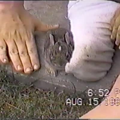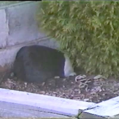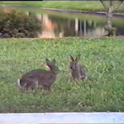 A rabbit runs past a man while he smokes a cigarette outside, and he screams loudly and jumps, then claims that a big-ass raccoon ran at him. His teen boy son comes out and asks if it was the rabbit, and the father says "no." Security footage.