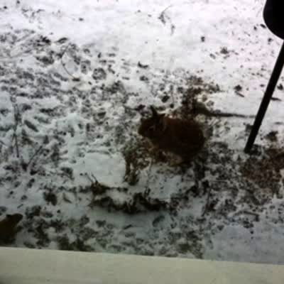 A bunny rabbit protects bird seed food from a squirrel outdoors in snow.