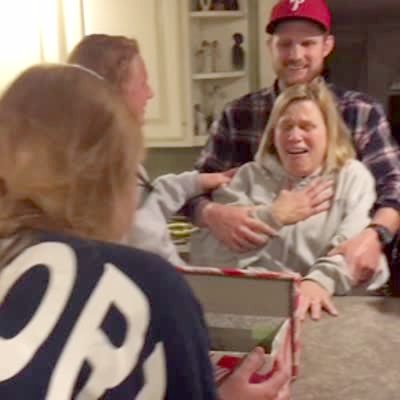A boy gives his mom a rabbit as a gift for mother's day in the kitchen indoors and she gets scared and almost falls out of her chair.