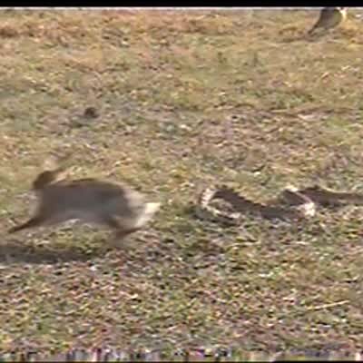 Rabbit and a really big rattlesnake fight in man's yard. Bunny chases snake up tree, snake runs away.