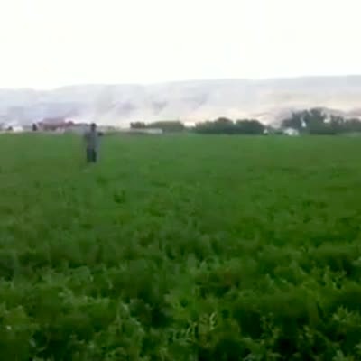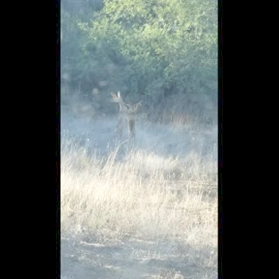 A woman in a car records a video out the window of two jack rabbits in a field that stand up on their back legs and punch at each other.