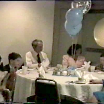 Chubby young boy hits the foot off of a purple bunny rabbit pinata, it flies into man's crotch. Groin hit.