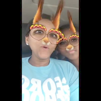 A woman and a young girl use a snapchat filter. The woman talks about them being rabbits and the girl corrects her saying they are squirrels.
