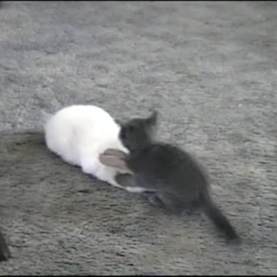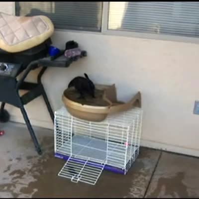 Pranks: An off camera woman shakes rabbit food in a kitchen and calls for a bunny rabbit who tries to run into the kitchen from a living room. It runs into a piece of saran wrap stretched across the doorway. The woman attempts to trick the rabbit again, but it doesn't fall for it and crawls under the saran wrap.